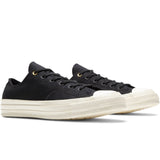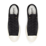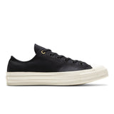 A tonal black colorway featuring patchwork style leather overlays and no branding offers a completely minimalist interpretation of the iconic Chuck 70, bringing the modern chic of total simplicity to a design with over a century of history behind it.